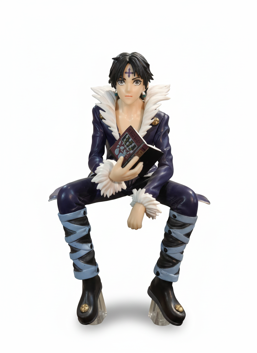 - Authentic Design: Chrollo is depicted in his signature dark, high-collared attire with white feather/fur trim and distinctive cross motifs. The pose captures him seated, engrossed in his ability-stealing book.