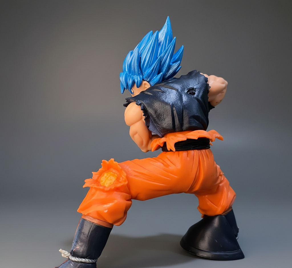 Battle-Hardened Sculpting: Showcases high-level craftsmanship through his torn blue undershirt and tattered orange gi, reflecting the grit of a long-duration battle.