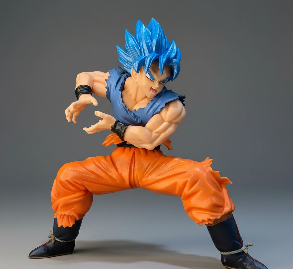 Divine Visual Authenticity: The figure accurately depicts Goku’s Super Saiyan Blue form, complete with his iconic spiky cerulean hair and intense blue eyes.