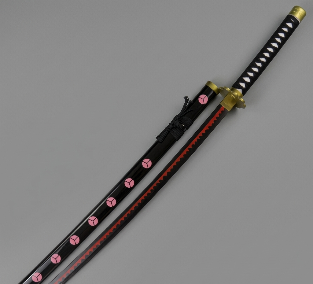 Exquisite Scabbard Craftsmanship: The saya is finished in a high-gloss black lacquer and features the traditional pink circular mon (crests) seen in the anime series.